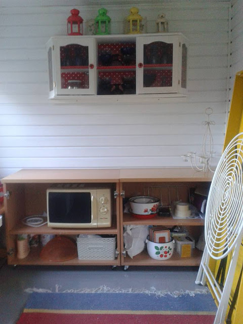 Mökin maalauksen jälkeen rakensin uuden keittiön suunnitelmieni mukaan eteisen seinustalle. Ikeasta ostin pari halpaa alakaappia sekä työtason ja yläkaapiksi tuli Tori.fi:stä ostamani vitriinikaappi. Vitriinin viereen mahtui sopivasti mökissä valmiiksi ollut pieni maustehylly (joka pitää vielä maalata) ja sen yläpuolelle veitsille magneettiteline. Pienen jenkkikaapin ostin Verkkokaupasta, se on vain 47,5 cm leveä, joten vie mahdollisimman vähän tilaa sivusuunnassa. Pakastinosion halusin ehdottomasti, jotta kesällä mökillä voi säilyttää jäätelöä ja tehdä jääpaloja, joten jenkkikaappi oli tähän tarkoitukseen juuri mainio. Ja tuo kaappi oli niin matalakin (korkeus noin 125 cm), että sen päällä voi pitää kahvinkeitintä ilman että sen käyttö on liian vaikeaa.
